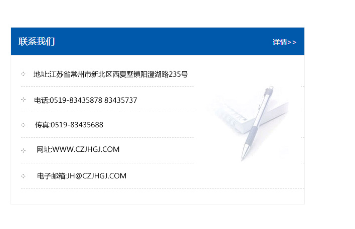 地址:常州市新北區友邦商務大廈1幢16、17層  電話:0519-85101652  傳真:0519-85112595  郵編:213022  網址:www_cz-jiayue_cn.hlhhwj.com  郵箱:xiajifengaa@163.com